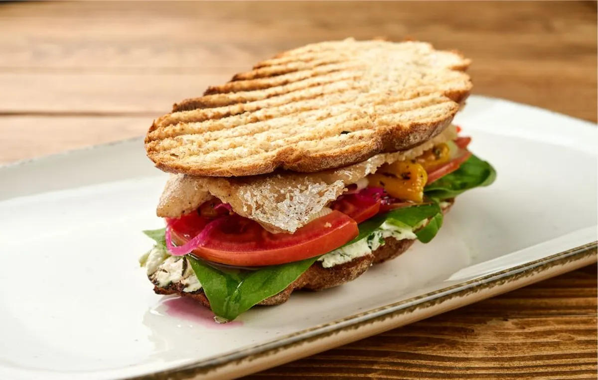 Whole grain bread, fried sig fillet, signature sauce, smoked pepper, fresh vegetables.